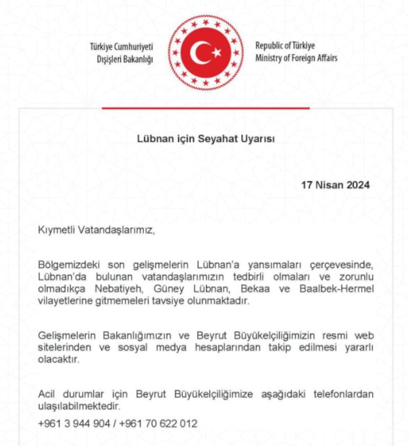 Bölgemizdeki son gelişmelerin Lübnan’a yansımaları çerçevesinde, Lübnan’da bulunan vatandaşlarımızın tedbirli olmaları ve zorunlu olmadıkça Nebatiyeh, Güney Lübnan, Bekaa ve Baalbek-Hermel vilayetlerine gitmemeleri tavsiye olunmaktadır.