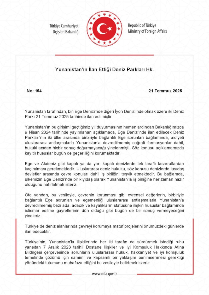 Türkiye Dışişleri Bakanlığı, Yunanistan tarafından, biri Ege Denizi'nde diğeri İyon Denizi'nde olmak üzere iki deniz parkı ilan edilmesine ilişkin yazılı açıklama yaptı.