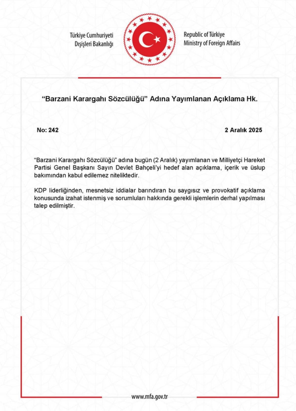 Dışişleri Bakanlığı, Kürdistan Demokrat Partisi'ne (KDP) bağlı "Barzani Karargahı Sözcülüğü"nün Milliyetçi Hareket Partisi Genel Başkanı Devlet Bahçeli’yi hedef alan açıklamasına sert tepki gösterdi.