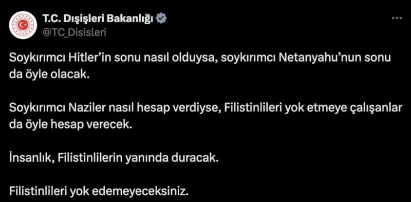 Dışişleri Bakanlığı, İsrail'e tepki olarak, "Soykırımcı Hitler'in sonu nasıl olduysa, soykırımcı (İsrail Başbakanı Binyamin) Netanyahu'nun sonu da öyle olacak" ifadesini kullandı.