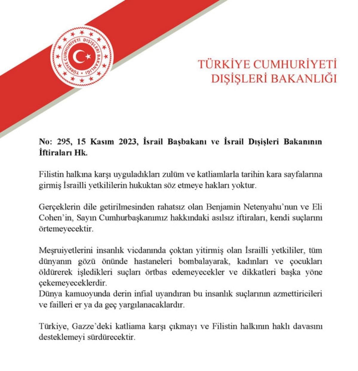 "Filistin halkına karşı uyguladıkları zulüm ve katliamlarla tarihin kara sayfalarına girmiş İsrailli yetkililerin hukuktan söz etmeye hakları yoktur. Gerçeklerin dile getirilmesinden rahatsız olan Binyamin Netenyahu’nun ve Eli Cohen’in, Sayın Cumhurbaşkanımız hakkındaki asılsız iftiraları, kendi suçlarını örtemeyecektir. Meşruiyetlerini insanlık vicdanında çoktan yitirmiş olan İsrailli yetkililer, tüm dünyanın gözü önünde hastaneleri bombalayarak, kadınları ve çocukları öldürerek işledikleri suçları örtbas edemeyecekler ve dikkatleri başka yöne çekemeyeceklerdir. Dünya kamuoyunda derin infial uyandıran bu insanlık suçlarının azmettiricileri ve failleri er ya da geç yargılanacaklardır. Türkiye, Gazze’deki katliama karşı çıkmayı ve Filistin halkının haklı davasını desteklemeyi sürdürecektir."