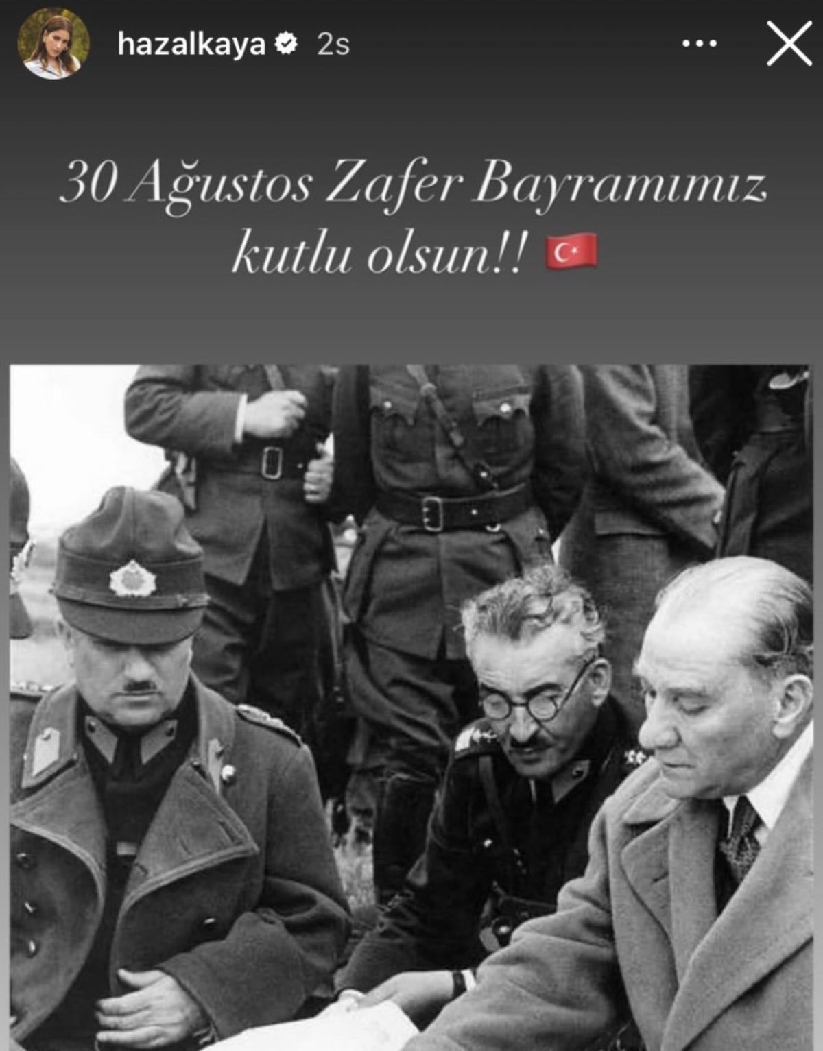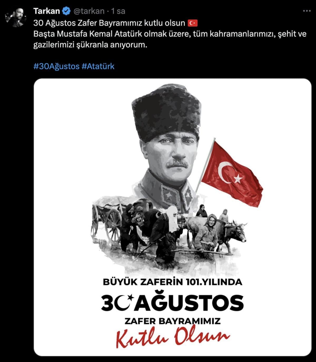 Ünlü şarkıcı paylaşımında, "30 Ağustos Zafer Bayramımız kutlu olsun! Başta Mustafa Kemal Atatürk olmak üzere, tüm kahramanlarımızı, şehit ve gazilerimizi şükranla anıyorum." ifadelerine yer verdi.