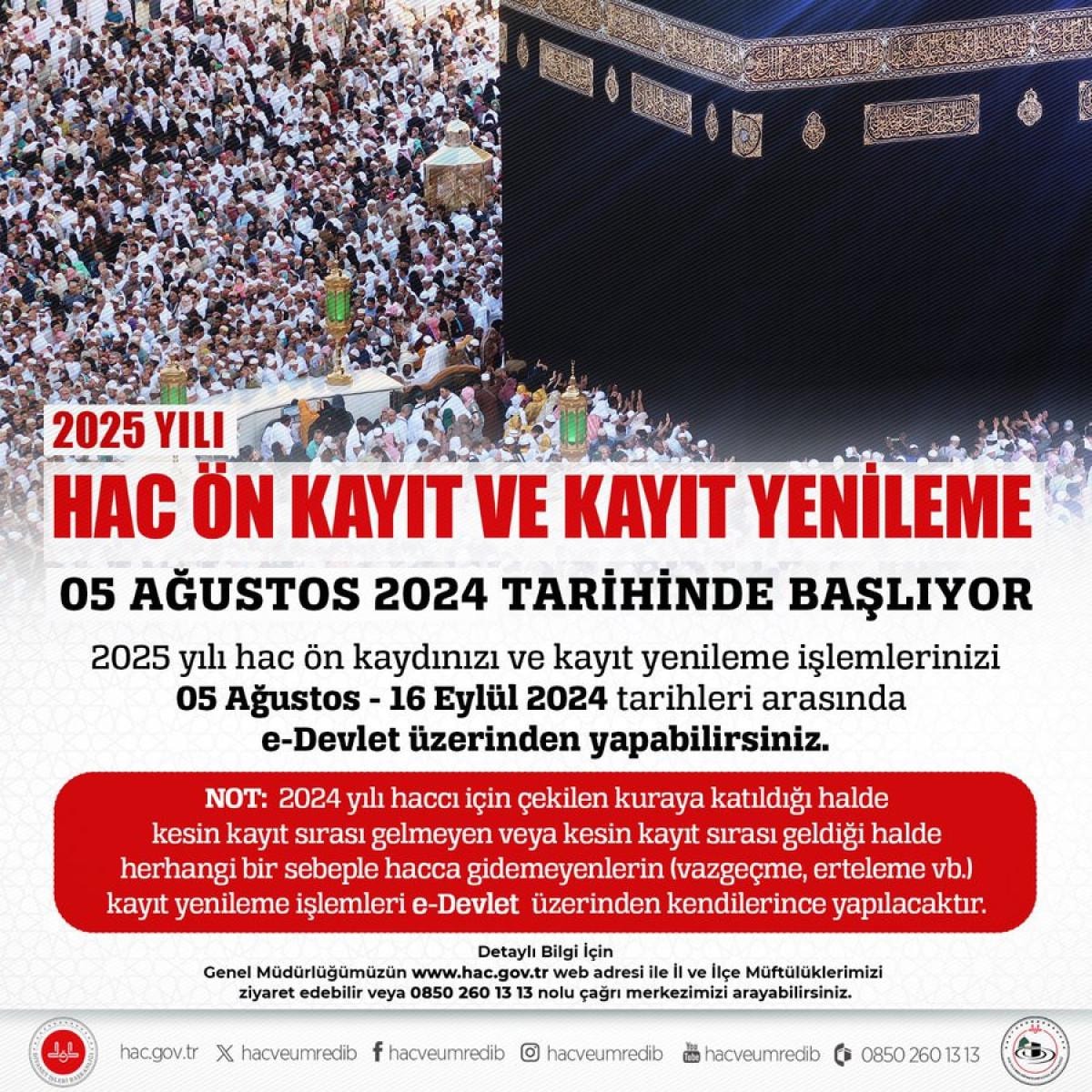 Diyanet İşleri Başkanlığı 2025 yılı hac organizasyonumuz kapsamında ön kayıt ve kayıt yenileme işlemleri 5 Ağustos'ta başlıyor.