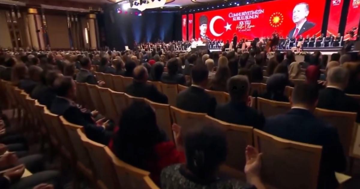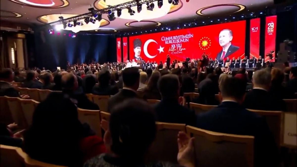 Cumhuriyet'in 101. yıl dönümü vesilesiyle Cumhurbaşkanlığı Külliyesi'nde program düzenlendi.