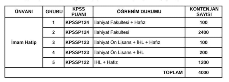 Başkanlığın resmi internet adresinden yapılan açıklamada, "Diyanet İşleri Başkanlığımız Taşra Teşkilatında münhal bulunan 4/B sözleşmeli pozisyonlarda istihdam edilmek amacıyla 2024 yılı Kamu Personel Seçme Sınavı (KPSS) B grubu puan sırası esas alınarak ilan edilen boş pozisyonların üç katı kadar aday arasından Başkanlıkça yapılacak sözlü sınav sonucuna göre Diyanet Akademisine Aday Din Görevlisi (İmam Hatip) alımı yapılacaktır." denildi.