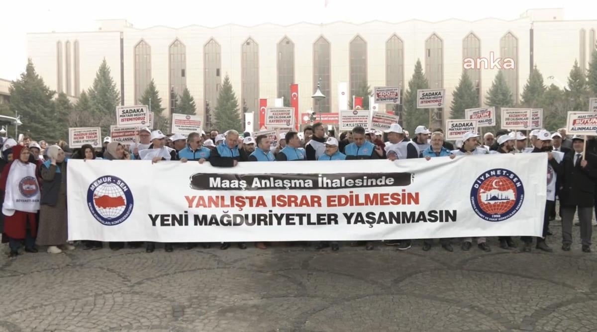 Diyanet çalışanları, "Maaş anlaşma ihalesinde yanlışta ısrar edilmesin. Yeni mağduriyetler yaşanmasın" yazılı pankart açarak "Sadaka miktarı hediye istemiyoruz", "Katılım bankaları kazanıyor, DİB çalışanları kaybediyor", "Yetersiz hizmete mecbur değiliz", "Maaş teklifi bütün bankalardan alınmalıdır", "Diyanet çalışanlarını mağdur eden hiçbir teklifi kabul etmiyoruz", "Maaşımı çekmek için 400 km yol gitmek istemiyoruz", "Maaş anlaşmasında rekabet şartları sağlansın" dövizleri taşıdı.