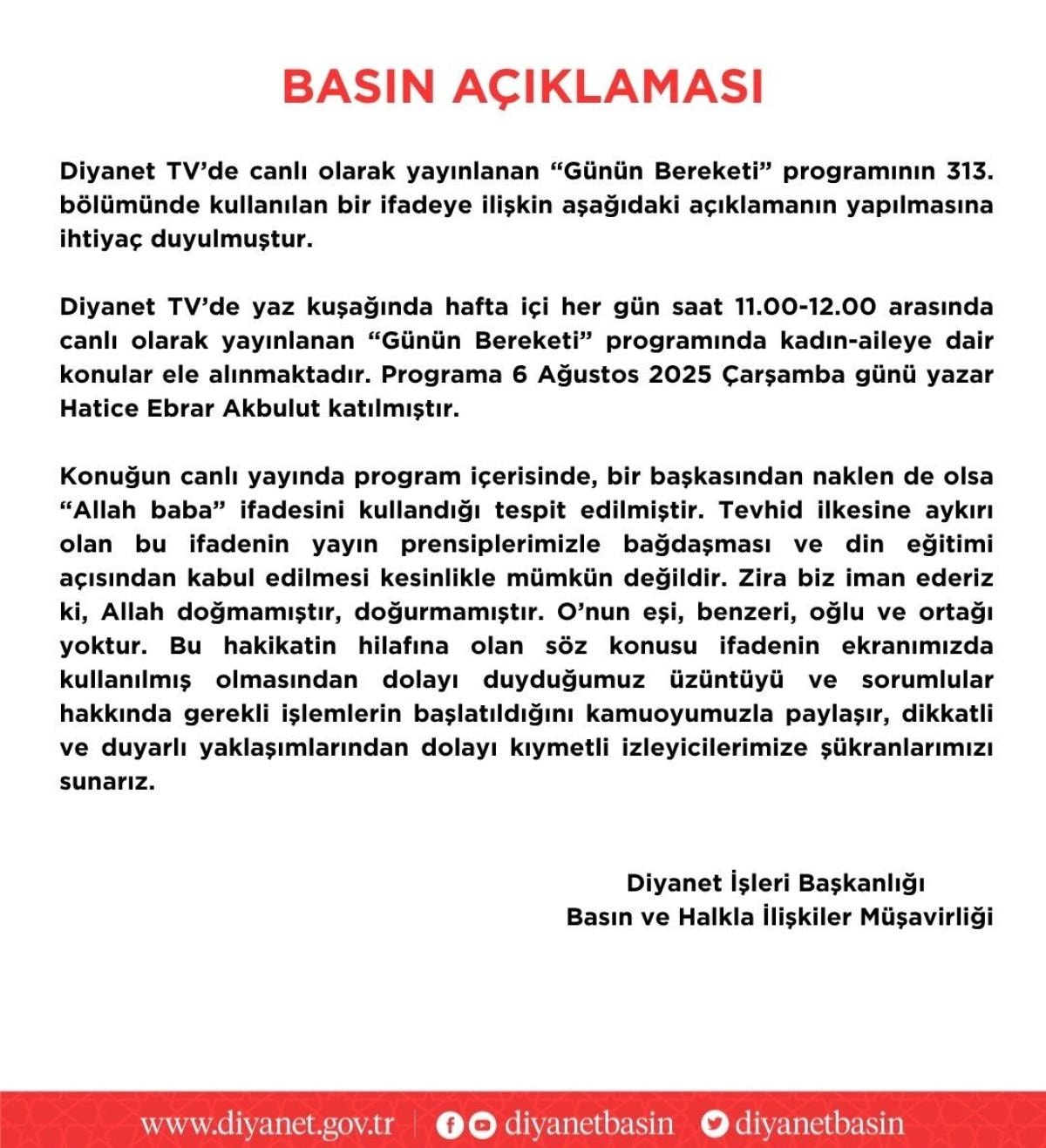 Diyanet İşleri Başkanlığı, Diyanet TV’de yayınlanan “Günün Bereketi” programında konuk tarafından dile getirilen “Allah baba” ifadesinin kabul edilemez olduğunu belirterek, sorumlular hakkında gerekli işlemlerin başlatıldığını açıkladı.