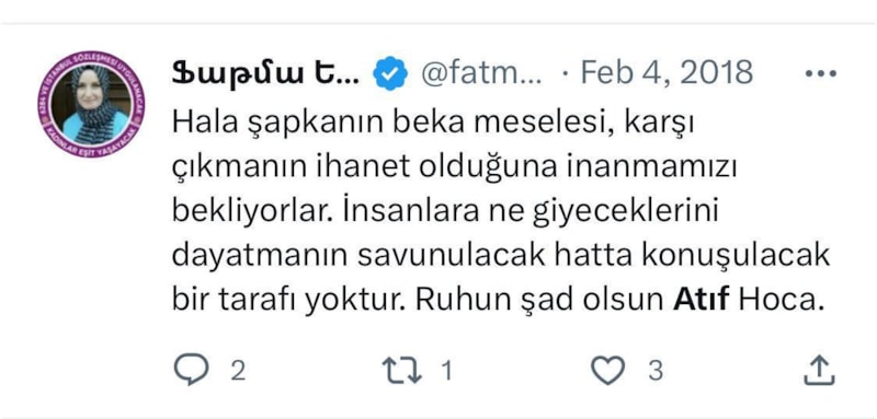 Hala şapkanın beka meselesi, karşı çıkmanın ihanet olduğuna inanmamamızı bekliyorlar. İnsanlara ne giyeceklerini dayatmanın savunulacak hatta konuşulacak bir tarafı yoktur. Ruhun şad olsun atıf hoca.