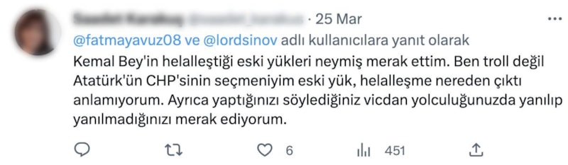 Samimi eleştiriler baş göz üstüne, sözüm trollerr idi. Samimi eleştirilere cevabımı tekrar edeyim: O paylaşımlar geçmiş yıllara ait. O sırada ben zaten muhafazakar mahallenin ezberleri ile yetişmiş bir kadının doğal yüklerini taşıyordum. Milyonlarca kadın da aynı yükü taşıyor. Zaten bu yükler sebebiyle helalleşiyoruz. Kemal Bey de kendi eski yükleri sebebiyle helalleşiyor. Birbirimizi yaralamamış olsaydık niye helalleşelim ki? Ben o sıralar sadece o konuda değil daha birçok konuda radikaldim. O da yine yetiştiğim ortamın etkisiydi. Milyonlarca kadın da öyle. Aslında herkes öyle. O yüzden ezberlerimizi bozacağız diyoruz. Buradan bu kadar yazabiliyorum, bunu uzun uzun konuşmamız gerekiyor. Ez cümle ; şu anki düşüncem: CHP'li kardeşlerimi (ve başka bir insanı da) incitecek birşey söylemekten Allah 'a sığınırım, vesselam.
