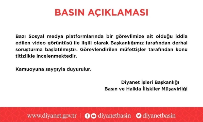 Videonun sosyal medya üzerinden yayılmasının ardından Diyanet İşleri Başkanlığı'nın resmi hesabından açıklama yapıldı.