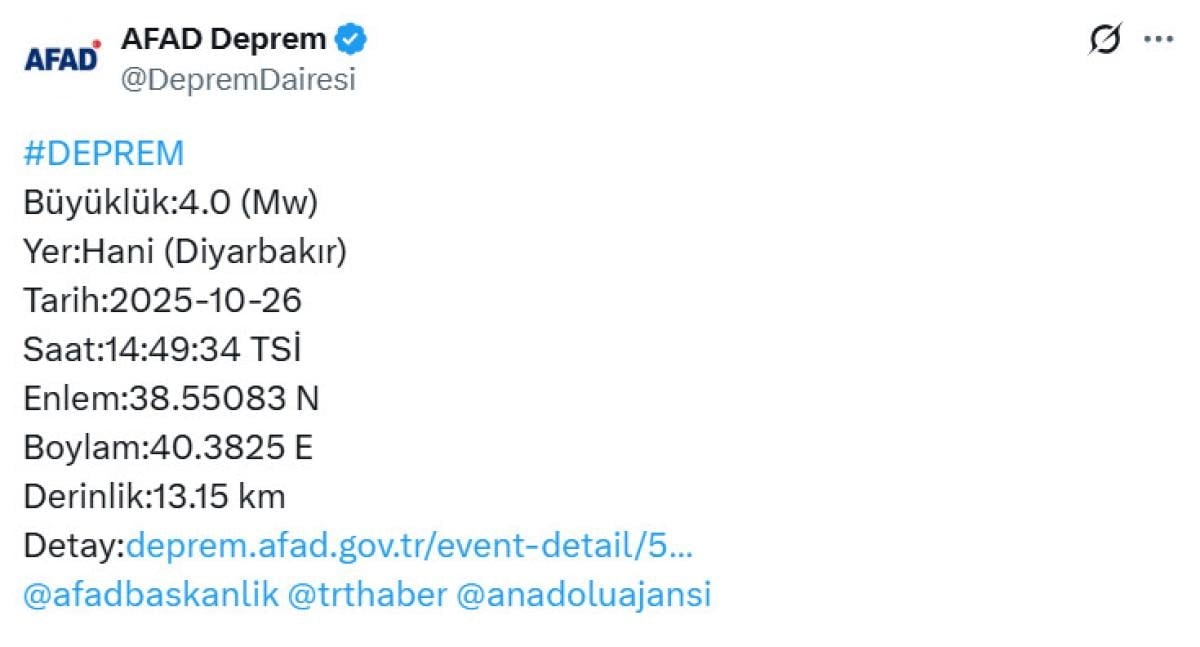 - Diyarbakır Hani'de 4.0 büyüklüğünde deprem oldu.