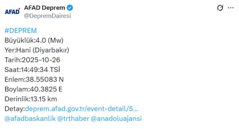 Afet ve Acil Durum Yönetimi Başkanlığı'ndan yapılan açıklamaya göre Diyarbakır'da saat 14.49 sıralarında merkez üssü Hani'de 4.0 büyüklüğünde deprem meydana geldi.