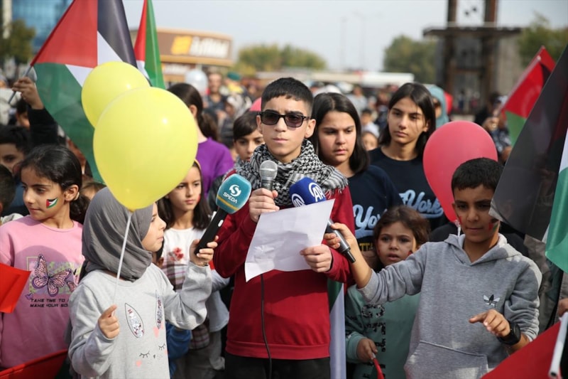 Dağkapı Meydanı'nda çocuklar adına açıklama yapan 12 yaşındaki Baran Eken, uzakta olsalar da kalplerinin Gazzeli çocuklar için attığını belirterek, "Orada çocuklar umutsuzluğa kapılmıyor, 'Allah bizimledir.' diyor." ifadesini kullandı.