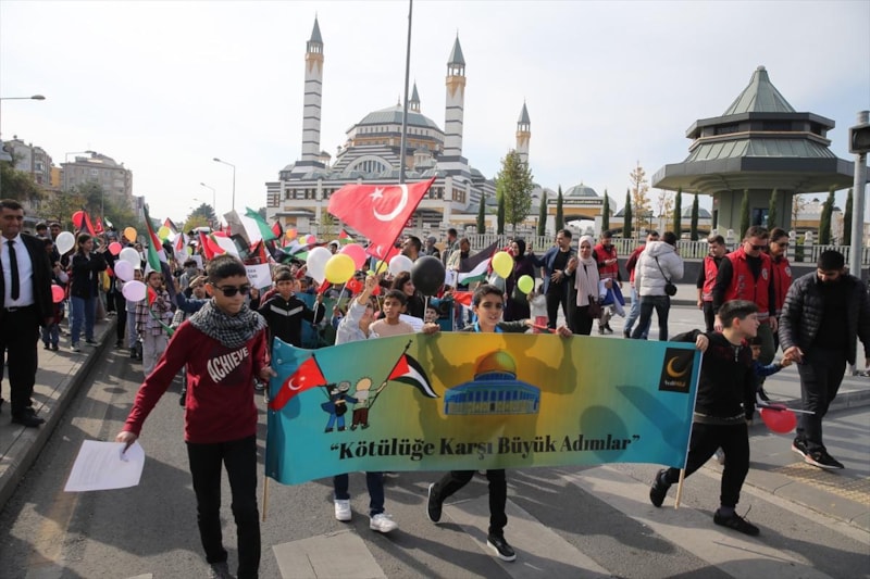 "Biz büyüdükçe Kudüs özgürleşecek" ve "Kötülüğe karşı büyük adımlar" yazılı pankart açan çocuklar ebeveynleri gözetiminde Elazığ Caddesi güzergahından Dağkapı Meydanı'na kadar yürüdü.