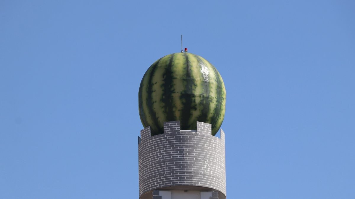 Dün şehirde bir tır üzerinde görüntülenen dev karpuz heykeli, bugün Kayapınar ilçesi Mastfroş Caddesi'ndeki kavşakta kurulan ve yaklaşık 25 metre yükseklikteki baz istasyonuna yerleştirildi.