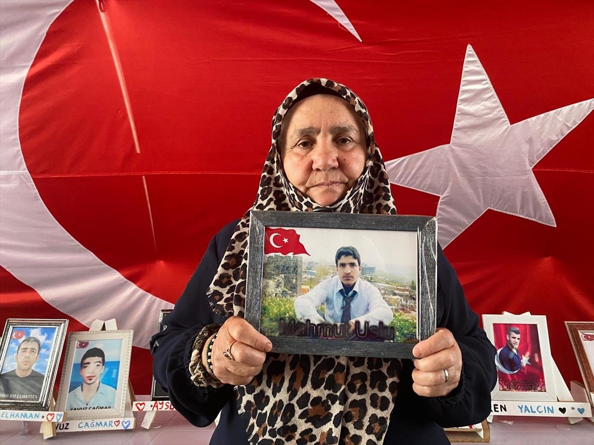Ellerinde çocuklarının fotoğrafıyla bekleyişini sürdüren annelerden Bedriye Uslu, 14 yıl önce kandırılarak dağa götürülen oğlu Mahmut için eylem yaptığını söyledi.