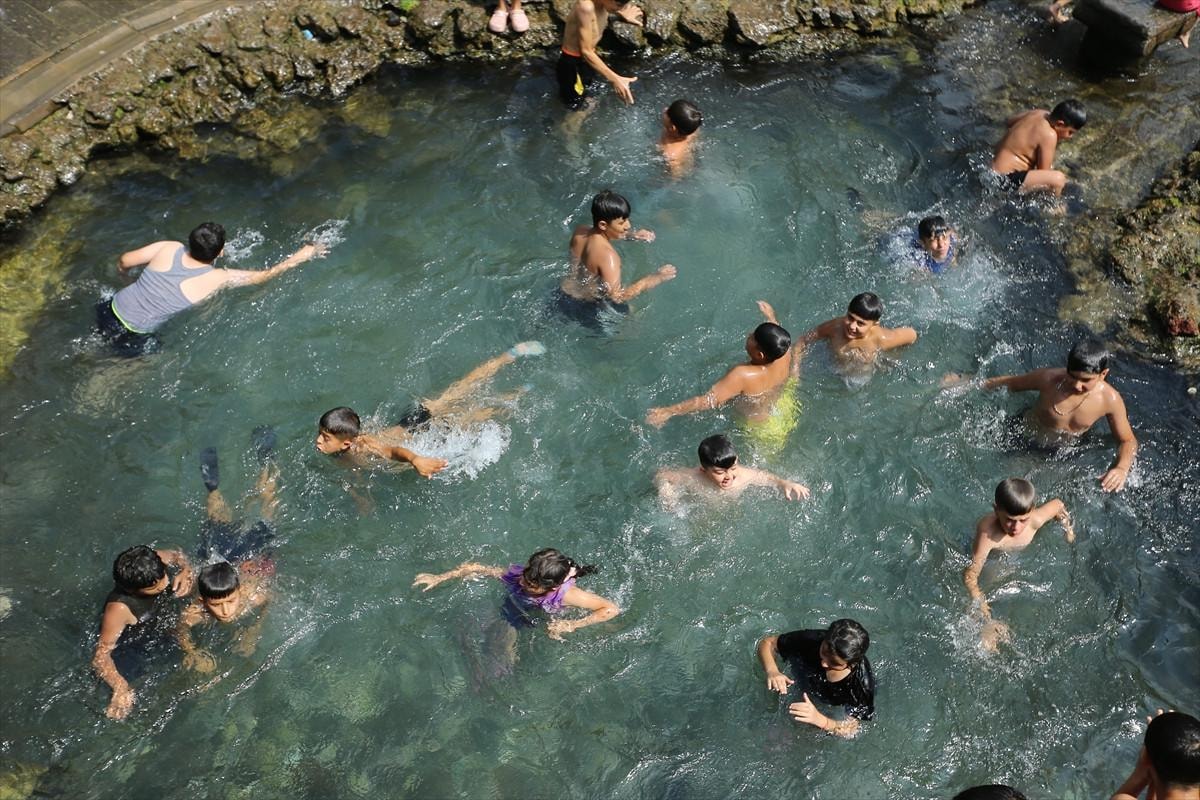 Kentte etkili olan sıcak hava nedeniyle çocuklar, merkez Sur ilçesindeki Anzele Parkı'nda bulunan süs havuzuna girerek serinlemeye çalıştı.