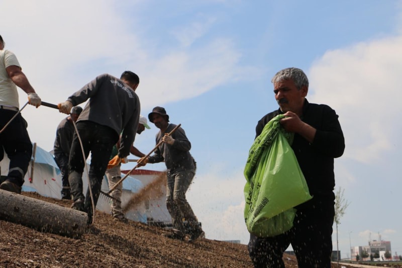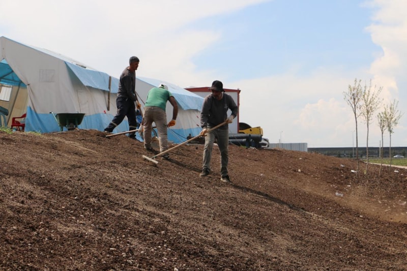 Kahramanmaraş merkezli depremlerden etkilenen Diyarbakır'da hazırlanan konteyner kentte, çevre düzenlemeleri devam ediyor.