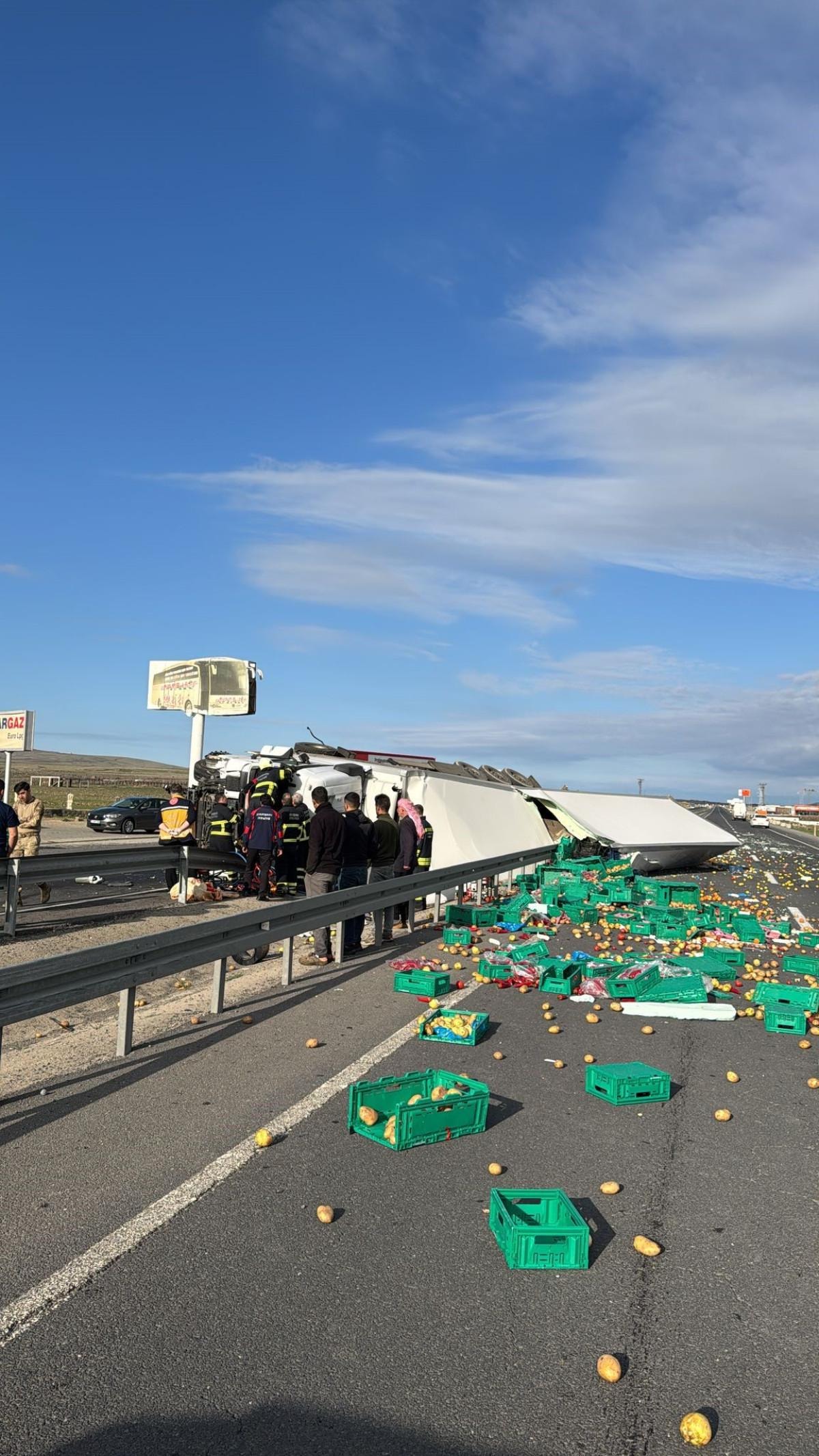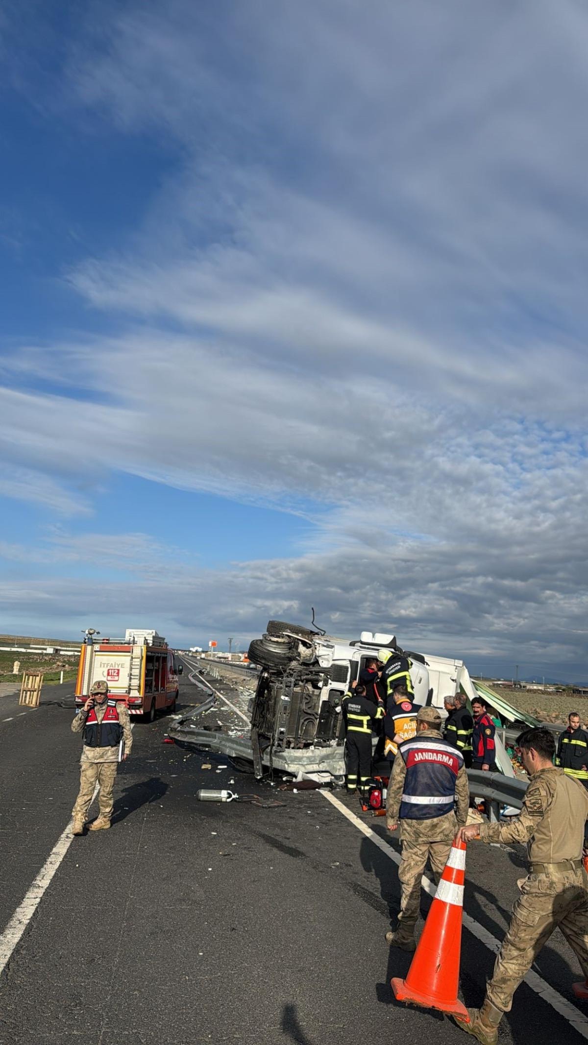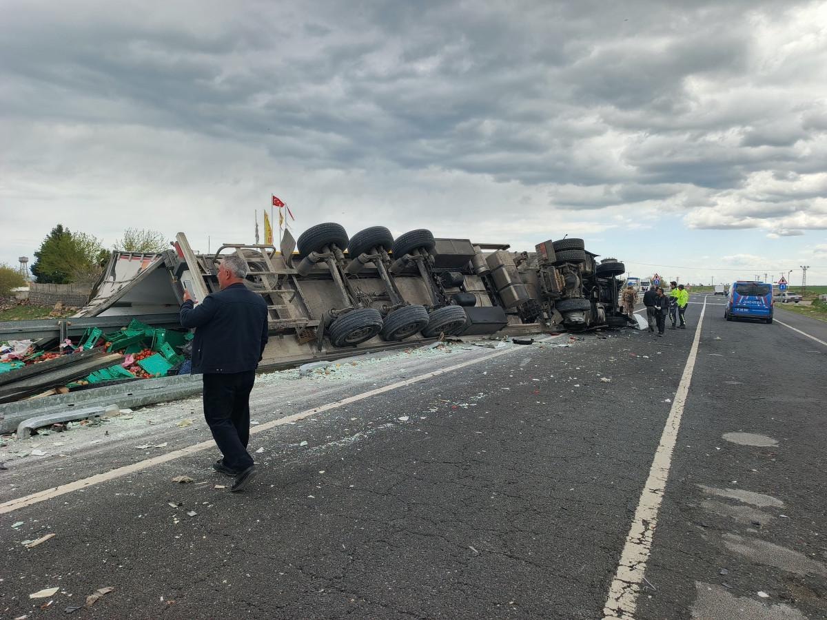 Diyarbakır-Şanlıurfa kara yolununda sebze yüklü kamyon, sürücüsünün direksiyon hakimiyetini kaybetmesi sonucu yol kenarındaki demir bariyerlere çarptı.
