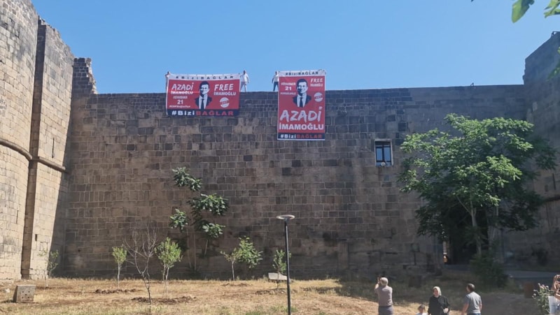 CHP’liler, Silivri'deki Marmara Kapalı Ceza İnfaz Kurumu’nda yolsuzluktan tutuklu bulunan Ekrem İmamoğlu için sabah saatlerinde Diyarbakır surlarına üzerlerinde ‘Azadi İmamoğlu’ ve ‘Free İmamoğlu’ yazılı pankartlar astı.