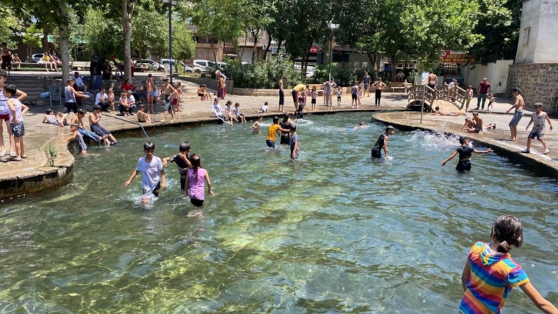Sur ilçesinde bulunan tarihi Anzele Parkı'na çoğu ebeveynleriyle gelen çocuklar süs havuzuna girerken, aileleri de ağaçların altında onları izledi.