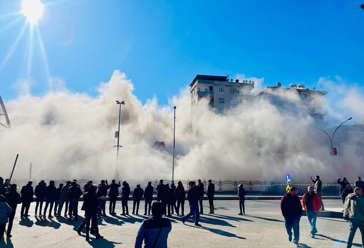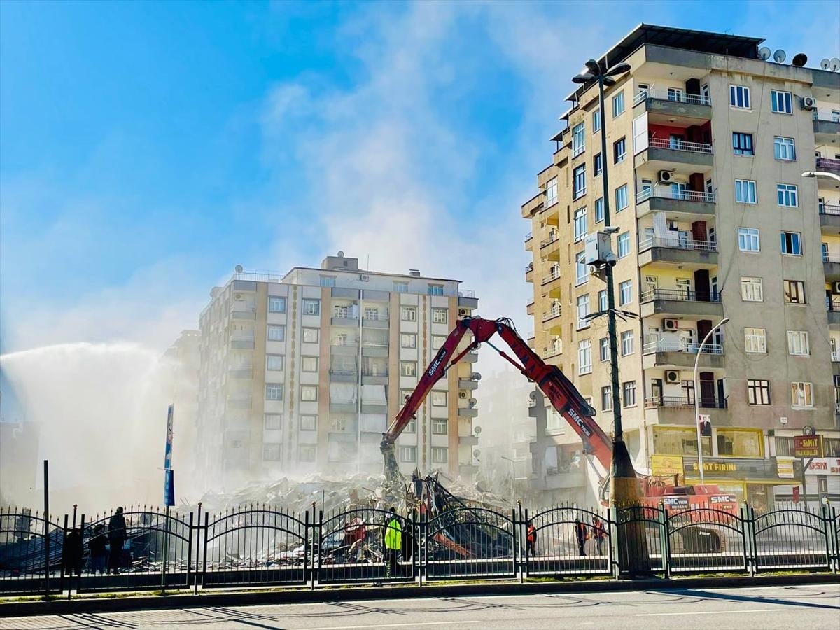 Yanındaki iki binanın da tedbir amacıyla boşaltılmasının ardından iş makineleriyle uzman ekiplerin gözetiminde hasarlı binanın yıkımına başlandı.