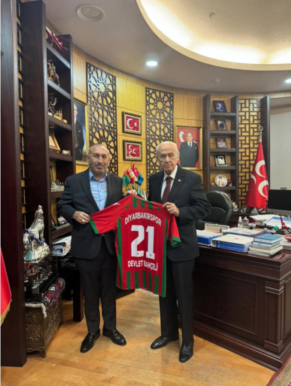 TFF Bal Bölgesel Amatör Lig ekiplerinden Diyarbakırspor Başkanı Bedirhan Akyol, MHP Diyarbakır İl Başkanı Miktat Aslan ile birlikte Devlet Bahçeli'yi ziyaret etti.