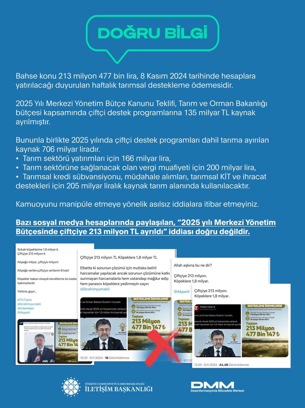 Bazı sosyal medya hesaplarında paylaşılan, “2025 yılı Merkezi Yönetim Bütçesinde çiftçiye 213 milyon TL ayrıldı” iddiası doğru değildir.