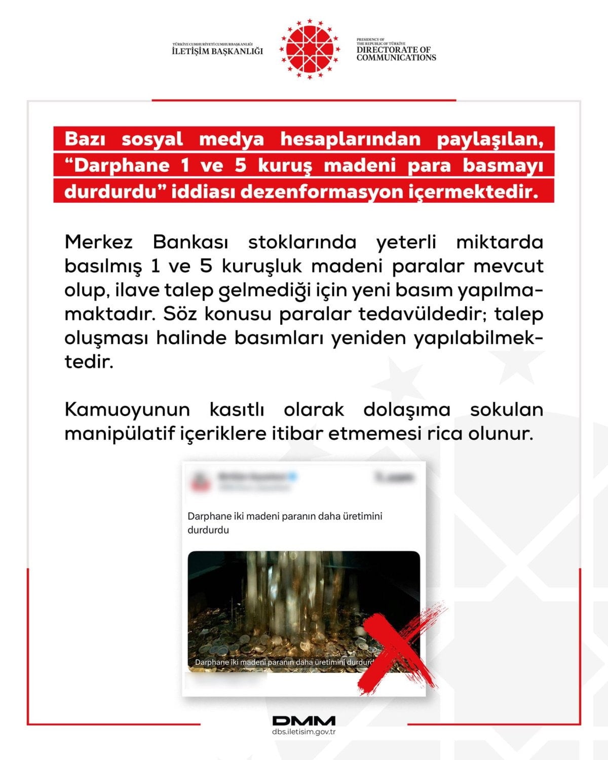 - DMM, "Darphane 1 ve 5 kuruş madeni para basmayı durdurdu" iddiasının yalan olduğunu açıkladı.