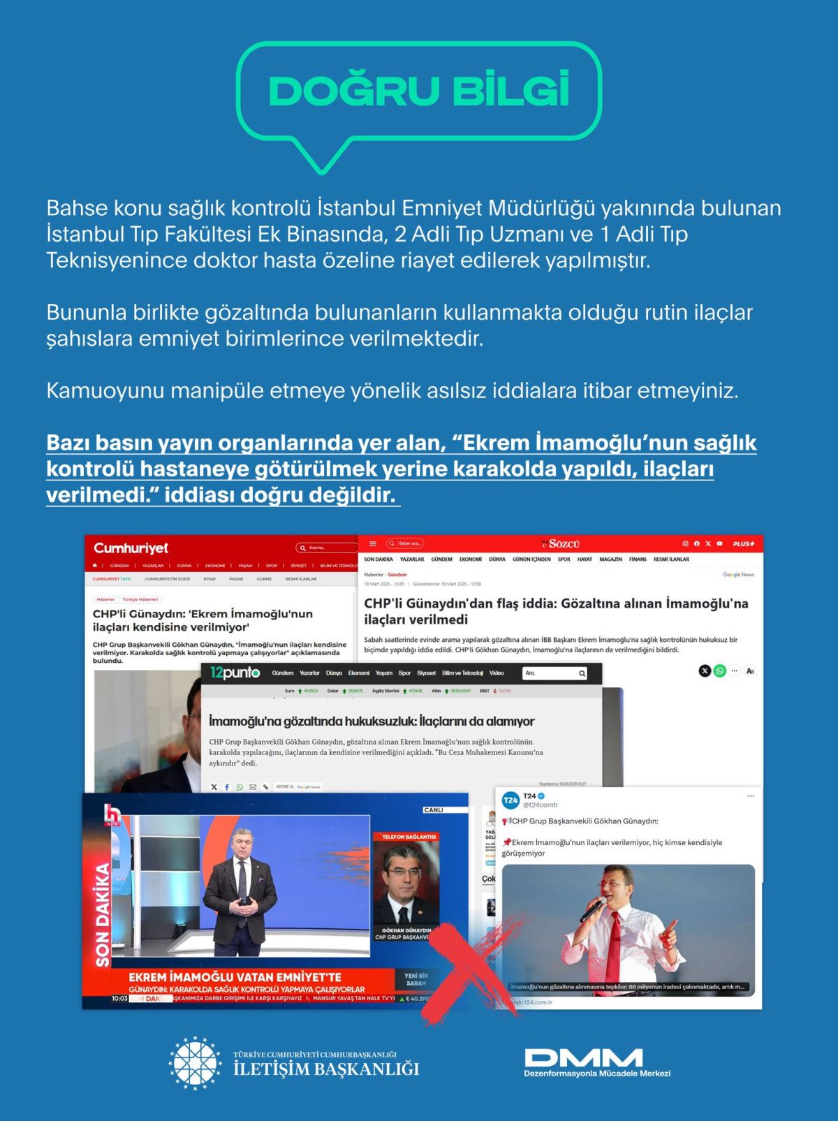 Bazı basın yayın organlarında yer alan, “Ekrem İmamoğlu’nun sağlık kontrolü hastaneye götürülmek yerine karakolda yapıldı, ilaçları verilmedi.” iddiası doğru değildir.