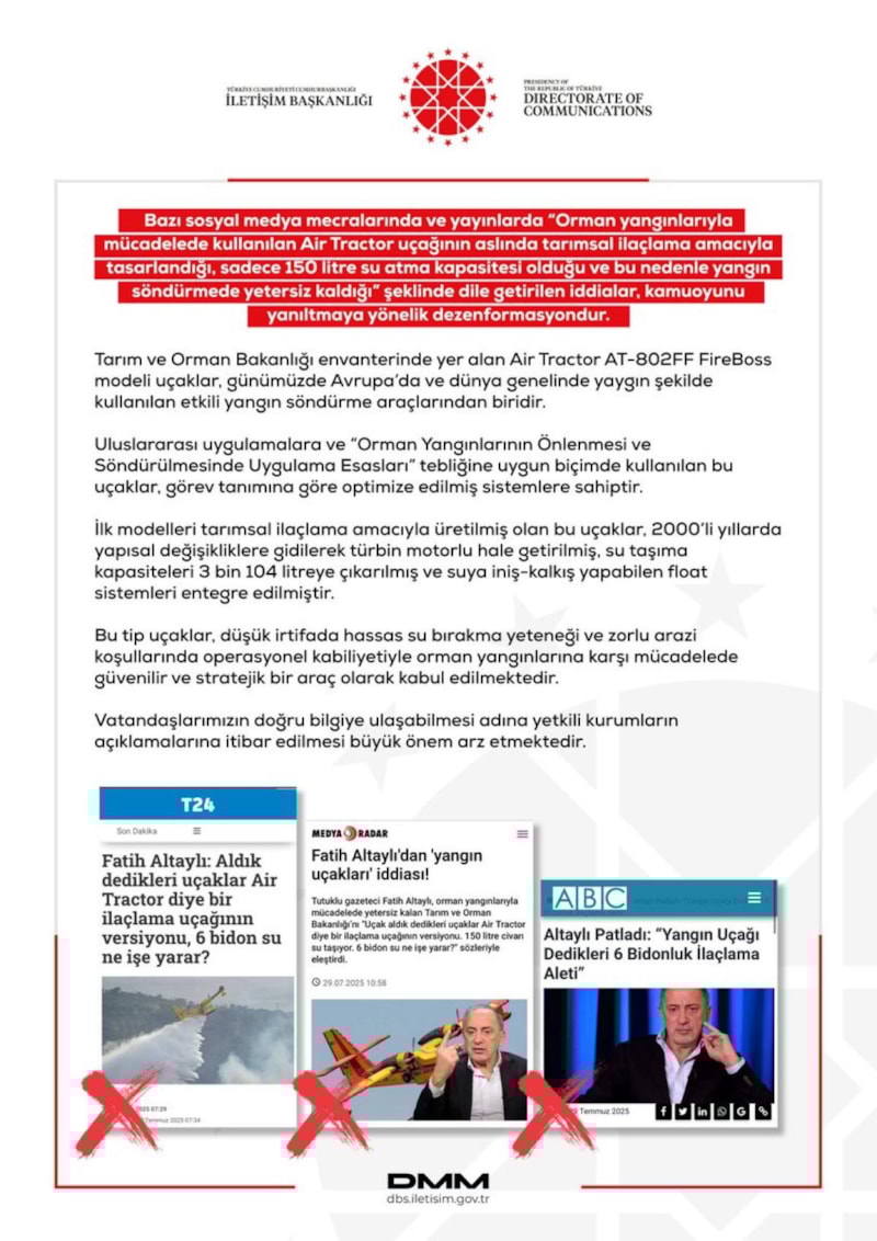 İletişim Başkanlığı Dezenformasyonla Mücadele Merkezi, orman yangınlarıyla mücadelede kullanılan Air Tractor uçağının yangın söndürmede yetersiz kaldığı yönündeki iddiaların gerçeği yansıtmadığını açıkladı.