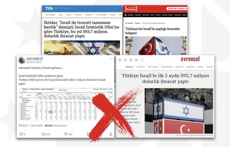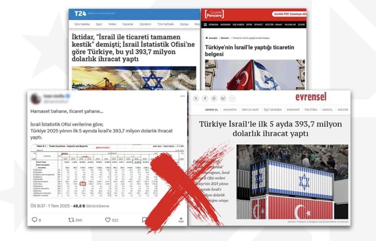 Cumhurbaşkanlığı İletişim Başkanlığı Dezenformasyonla Mücadele Merkezi (DMM), bazı basın yayın organlarında ve sosyal medya hesaplarında dolaşıma sokulan, "Türkiye, İsrail'e ilk 5 ayda 393,7 milyon dolarlık ihracat yaptı" iddiasının tümüyle yalan olduğunu vurgulayan bir açıklama yayımladı.