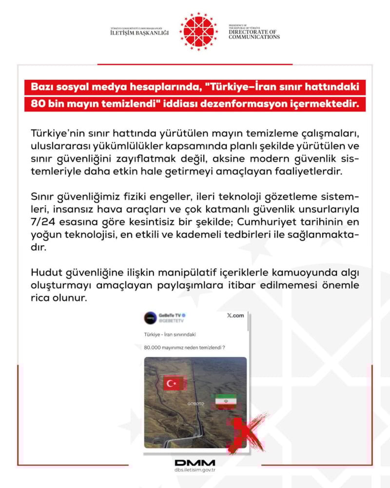 Cumhurbaşkanlığı İletişim Başkanlığı, Dezenformasyonla Mücadele Merkezi'nin sosyal medya hesabından yapılan açıklamada, söz konusu paylaşımların gerçeği yansıtmadığı belirtilerek, Türkiye’nin sınır hattında yürütülen mayın temizleme çalışmalarının uluslararası yükümlülükler kapsamında planlı ve kontrollü şekilde sürdürüldüğü ifade edildi.