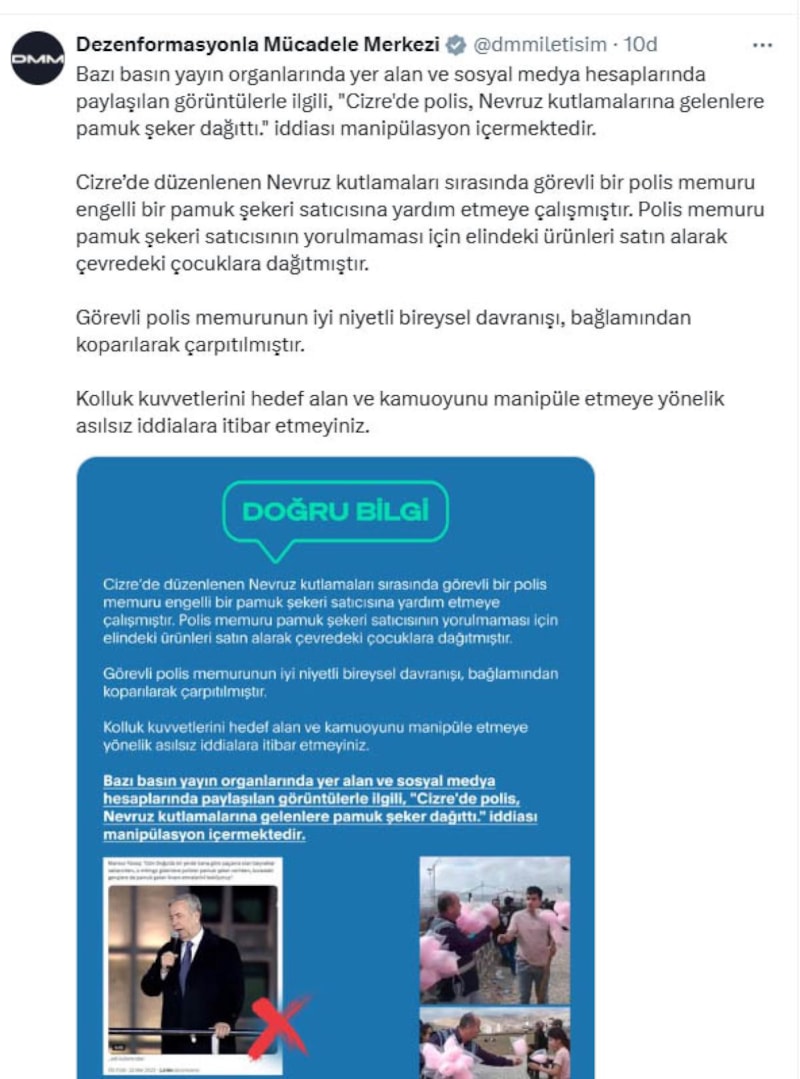 İletişim Başkanlığı Dezenformasyonla Mücadele Merkezi, Cizre’deki Nevruz kutlamalarına ilişkin "polis pamuk şeker dağıttı" iddialarının manipülasyon içerdiğini, polisin engelli satıcıya yardım amaçlı ürünleri satın alıp çocuklara dağıttığını duyurdu.