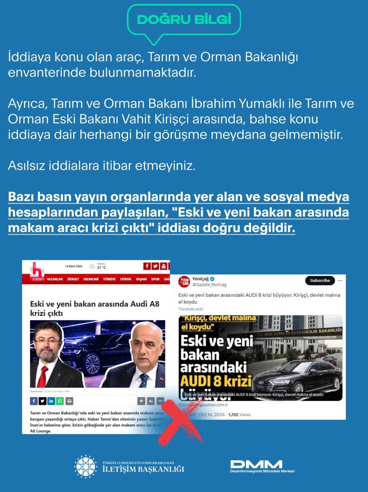 Tarım ve Orman Bakanlığı’nda eski ve yeni bakan arasında bir makam aracı krizi yaşandığına dair çıkan iddialar üzerine İletişim Başkanlığı Dezenformasyonla Mücadele Merkezi (DMM) açıklama yaptı.