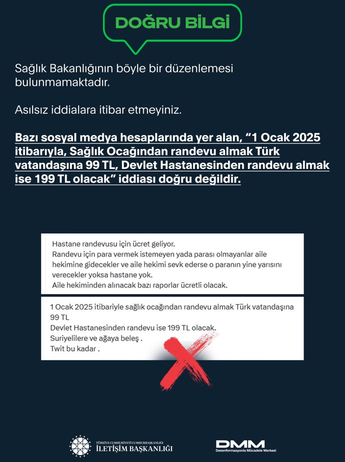 Bazı sosyal medya hesaplarında yer alan, “1 Ocak 2025 itibarıyla, Sağlık Ocağından randevu almak Türk vatandaşına 99 TL, Devlet Hastanesinden randevu almak ise 199 TL olacak” iddiası doğru değildir.