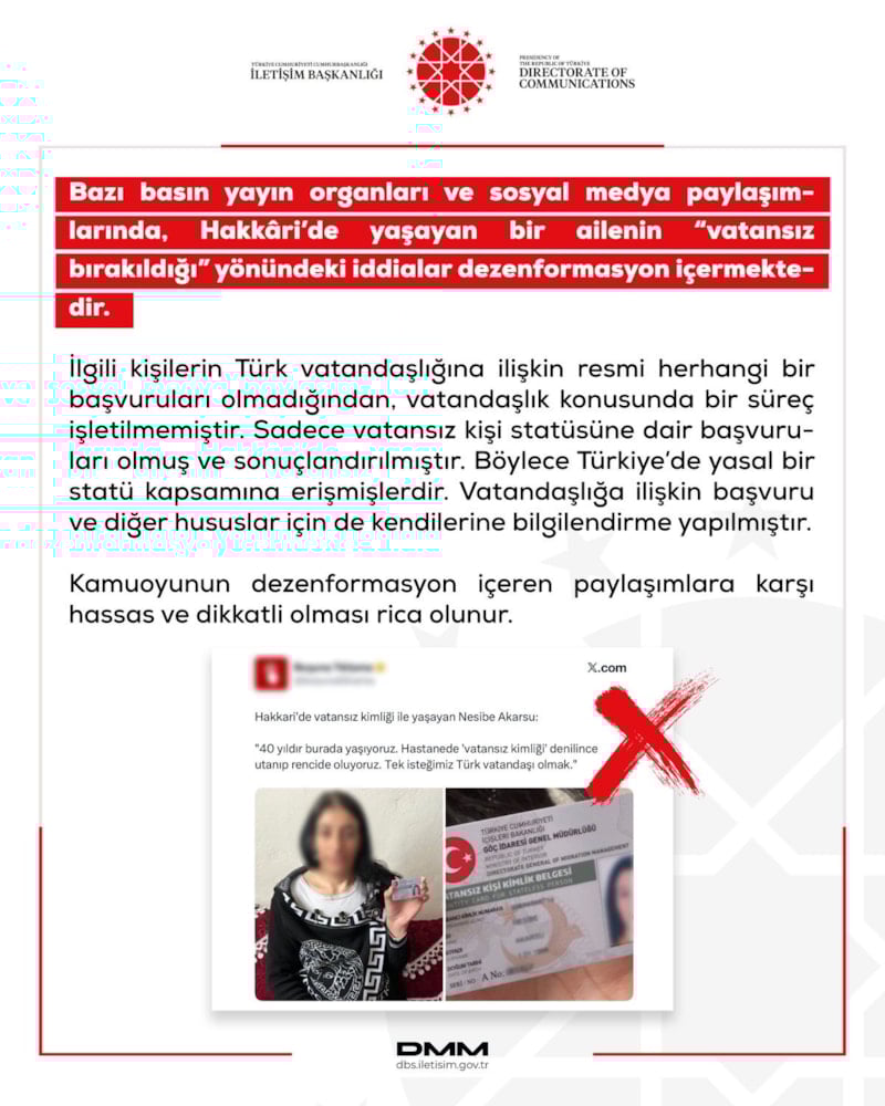 Hakkari'de "vatansız kişi kimlik belgesi" ile yaşadıkları ve mağdur oldukları iddia edilen aileyle ilgili Dezerformasyonla Mücadele Merkezi'nden açıklama geldi. Merkez, ailenin vatandaşlığa dair bir başvurusu bulunmadığını duyurdu.