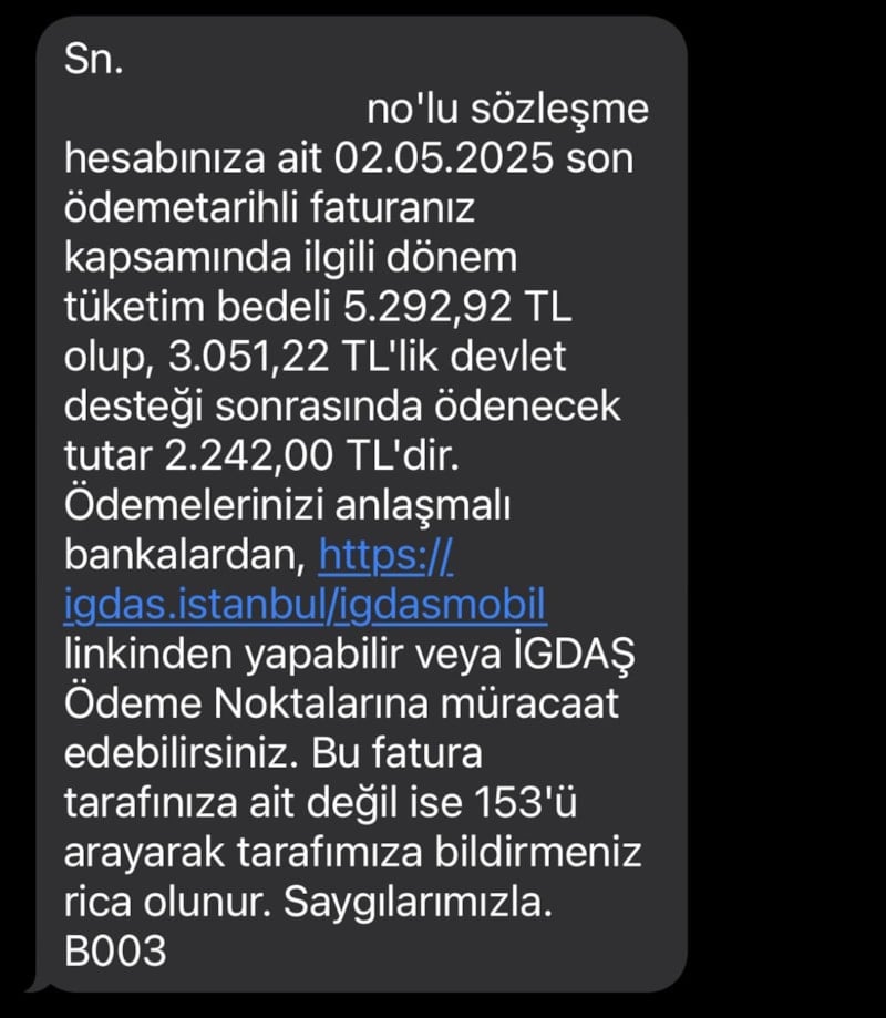 Buna göre SMS ile bildirilen faturalarda faturanın toplam tutarı, verilen destek ve ödenmesi gereken tutar ayrı ayrı yer alıyor.