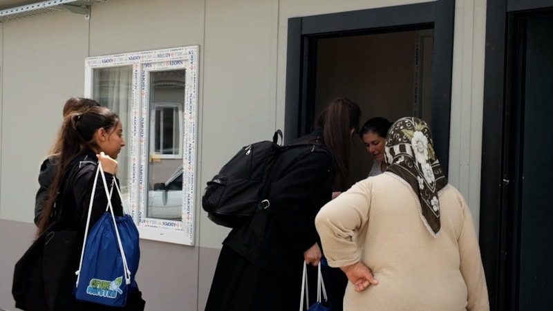 Gönüllü kadınlar, Nurdağı'nda konteyner kentte yaşayan afetzedeleri ziyaret ederek içinde hijyen ve temizlik malzemesinin bulunduğu hediye paketleri verdi.