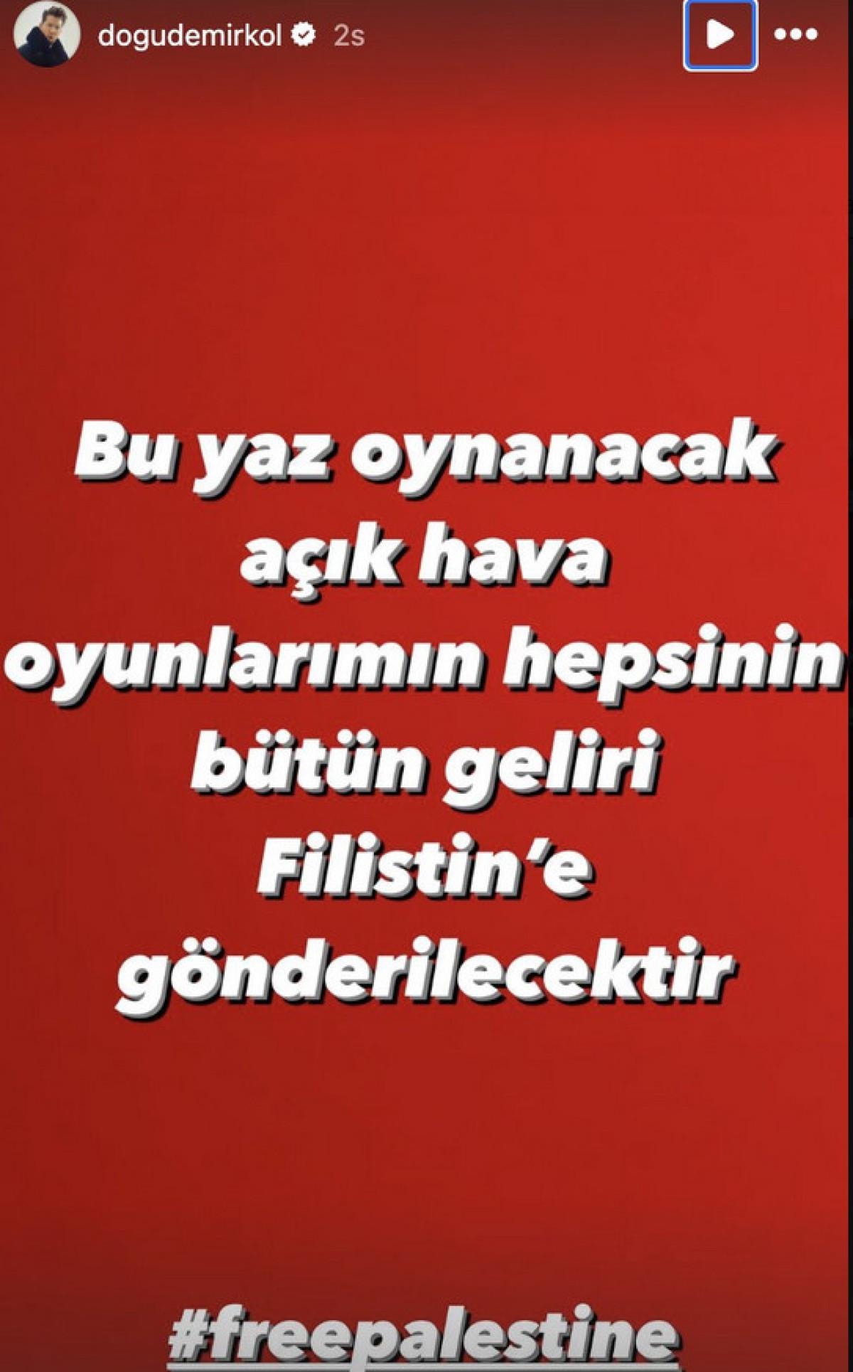 Doğu Demirkol, sosyal medya hesabından yaptığı açıklamada, yaz aylarında oynayacağı tüm açık hava oyunlarının gelirlerini Filistin'e bağışlayacağını belirtti.