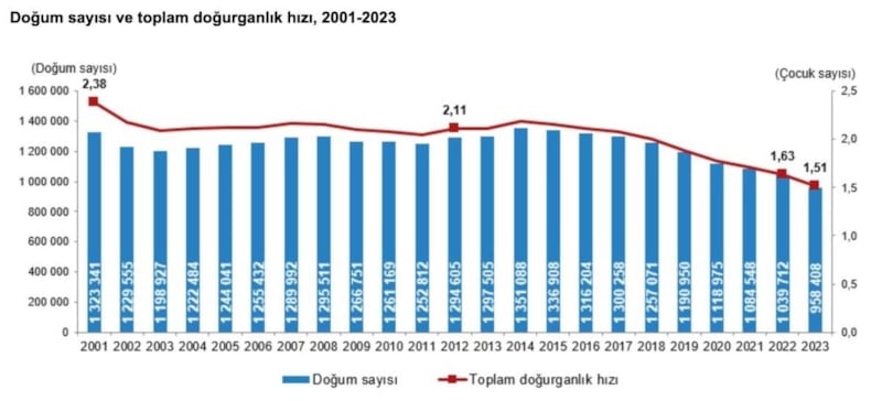 Bir kadının doğurgan olduğu dönem (15-49 yaş grubu) boyunca doğurabileceği ortalama çocuk sayısını ifade eden "toplam doğurganlık hızı", 2001'de 2,38 çocukken, 2023'te 1,51 çocuk olarak gerçekleşti.