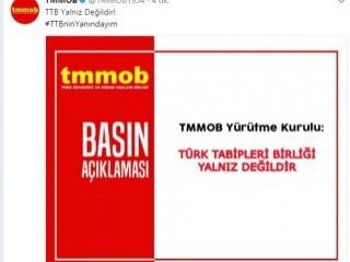 TMMOB, paylaştığı tweete #TTBninYanındayım yazarak bir açıklama yaptı ve açıklamanın kapağında "Türk Tabipler Birliği" yalnız değildir ifadelerine yer verdi.
