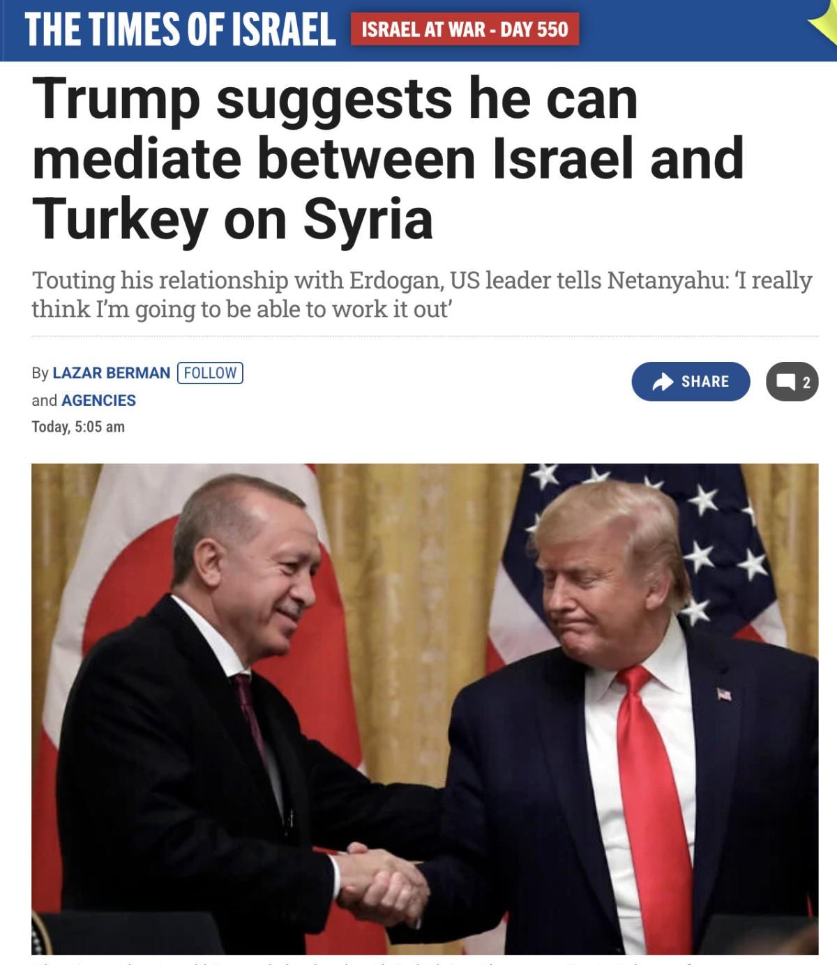 Times of Israel haberi, "Trump Erdoğan ile harika ilişkileri olduğunu söylüyor" başlığı ile manşetlerinde ilk sıraya taşıdı.