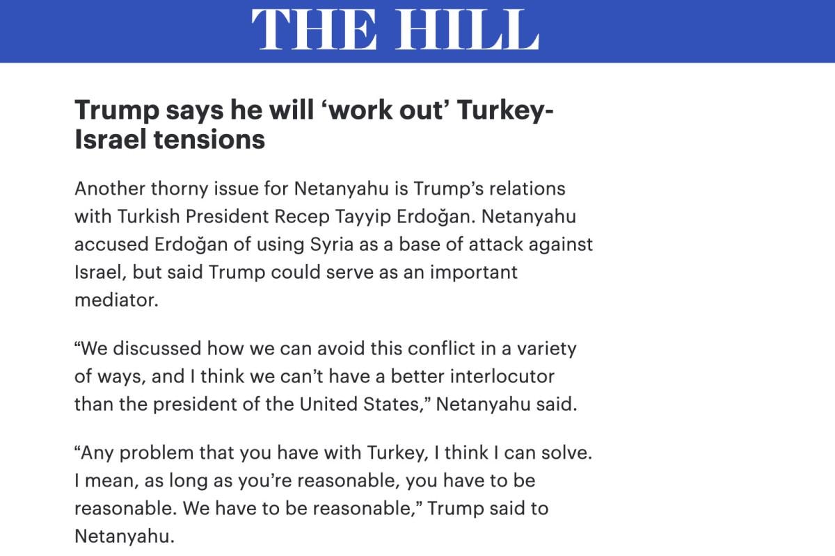Haberinin içeriğinde, Netanyahu'nun Türkiye'nin ülkesi için büyük bir tehdit olduğunu ve bu konudaki endişelerini dile getirdiğini Trump'ın ise "Türkiye ile yaşadığınız her sorunu çözebileceğimi düşünüyorum. Siz makul olduğunuz sürece; bu konuda siz de biz de makul olmalıyız." sözleri ile cevap verdiği yazıldı.