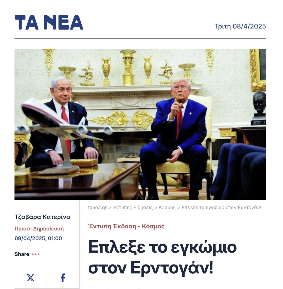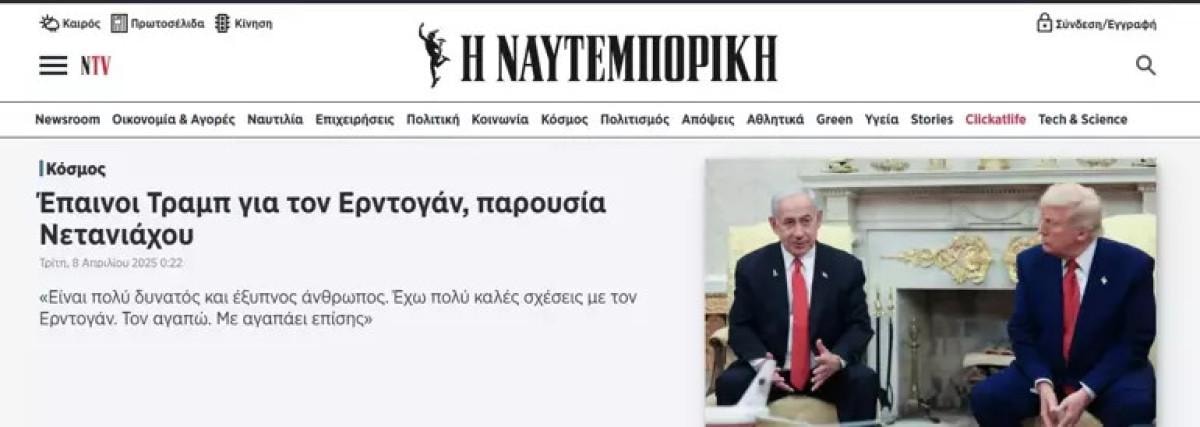 Yunanistan merkezli Naftemporiki gazetesi, Donald Trump'ın açıklamalarını, "Trump Netanyahu'nun gözü önünde Erdoğan'ı övdü" başlığı ile öne çıkardı.