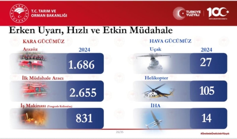 Karada bin 686 arazöz, 2 bin 655 ilk müdahale aracı, 831 iş makinesi; havada 27 uçak, 105 helikopter ve 14 İHA ile geniş ve etkili filosuyla Türkiye dünyaya örnek birçok mücadelede başarılı sınavlar verdi.