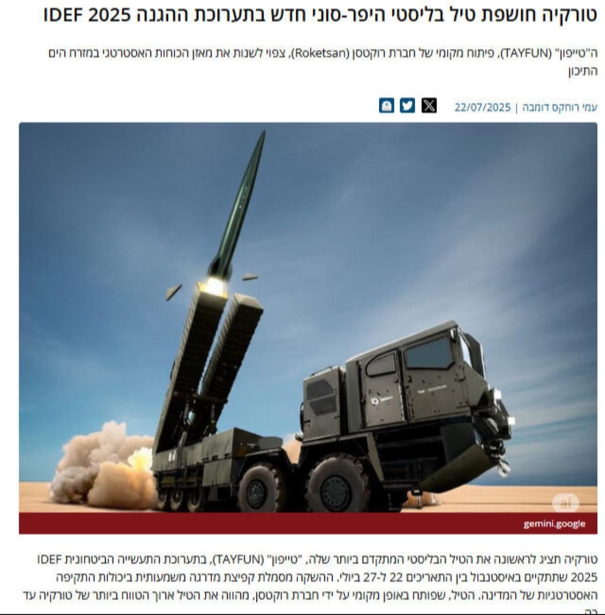 İsrail merkezli savunma yayın organı IsraelDefense, Tayfun Blok-4’ün IDEF 2025’te sergilenmesini, “Doğu Akdeniz’deki stratejik dengeleri etkileyebilecek bir gelişme” olarak değerlendirdi.