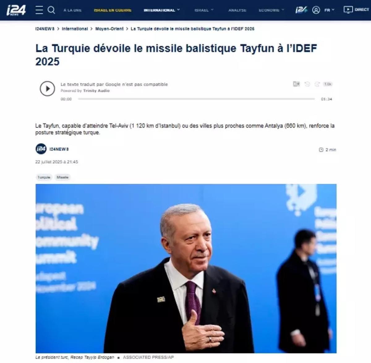 Fransız I24 News, TAYFUN BLOK-4 hipersonik balistiktik füzesiyle Türkiye'nin stratejik konumunu güçlendirdiğini söyledi. Tel Aviv-İstanbul arasının 1120 km, Antalya-Tel Aviv arasındaki mesafenin ise 660 km olduğunun altını çizen I24, TAYFUN BLOK-4'ün 1000 km'lik menzili olduğun dikkat çekti. Haberde, 7 bin 200 kilogram ağırlığındaki TAYFUN'un "olağanüstü bir isabet oranına sahip olduğu" kaydedildi.