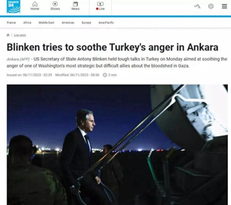 Blinken'ın Gazze'deki katliam için Türkiye'nin öfkesini dindirmeyi hedeflediğini yazdı.