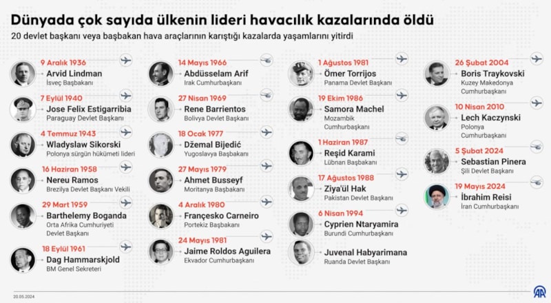 1936'da dönemin İsveç Başbakanı Arvid Lindman'dan Şubat 2024'te eski Şili Devlet Başkanı Sebastian Pinera'ya kadar 20 devlet başkanı veya başbakan, hava araçlarının karıştığı kazalarda yaşamlarını yitirdi, çok azı kurtuldu...